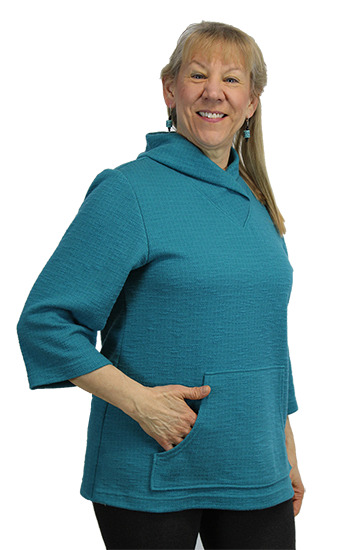 Patterns are sized ex-small to 3X and are designed for stable stretch knits and sweater knits. Pattie will have try-ons of all sizes to aid in fitting.